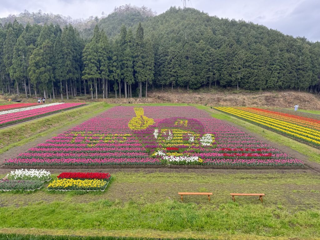 太陽の塔、ミャクミャク、さくら、チューリップ、ネモフィラ、菜の花、キクモモの大共演