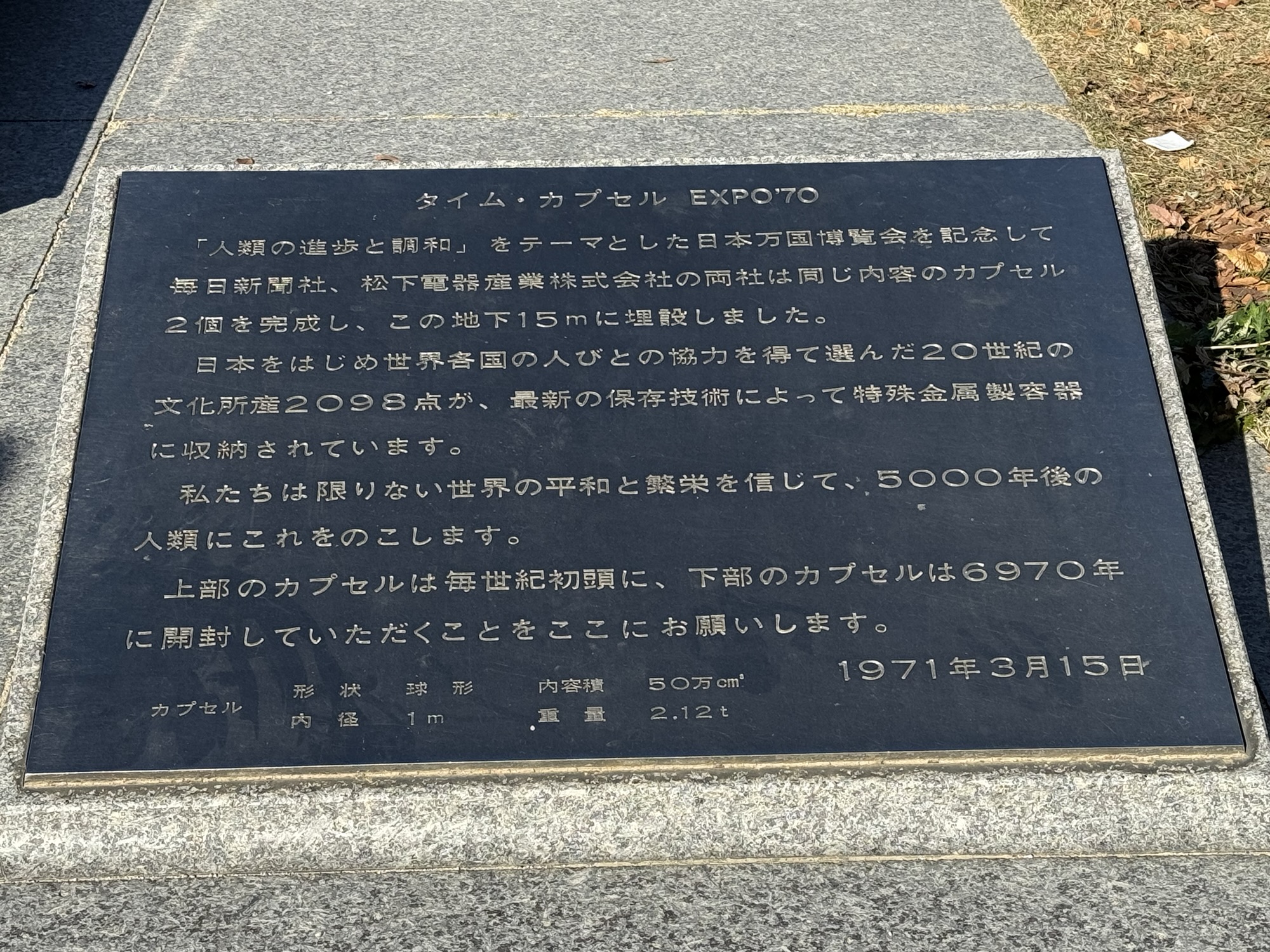 55年前の大阪万博の時に埋められたそうで、5000年後の6970年に開封されることになっているそうです。