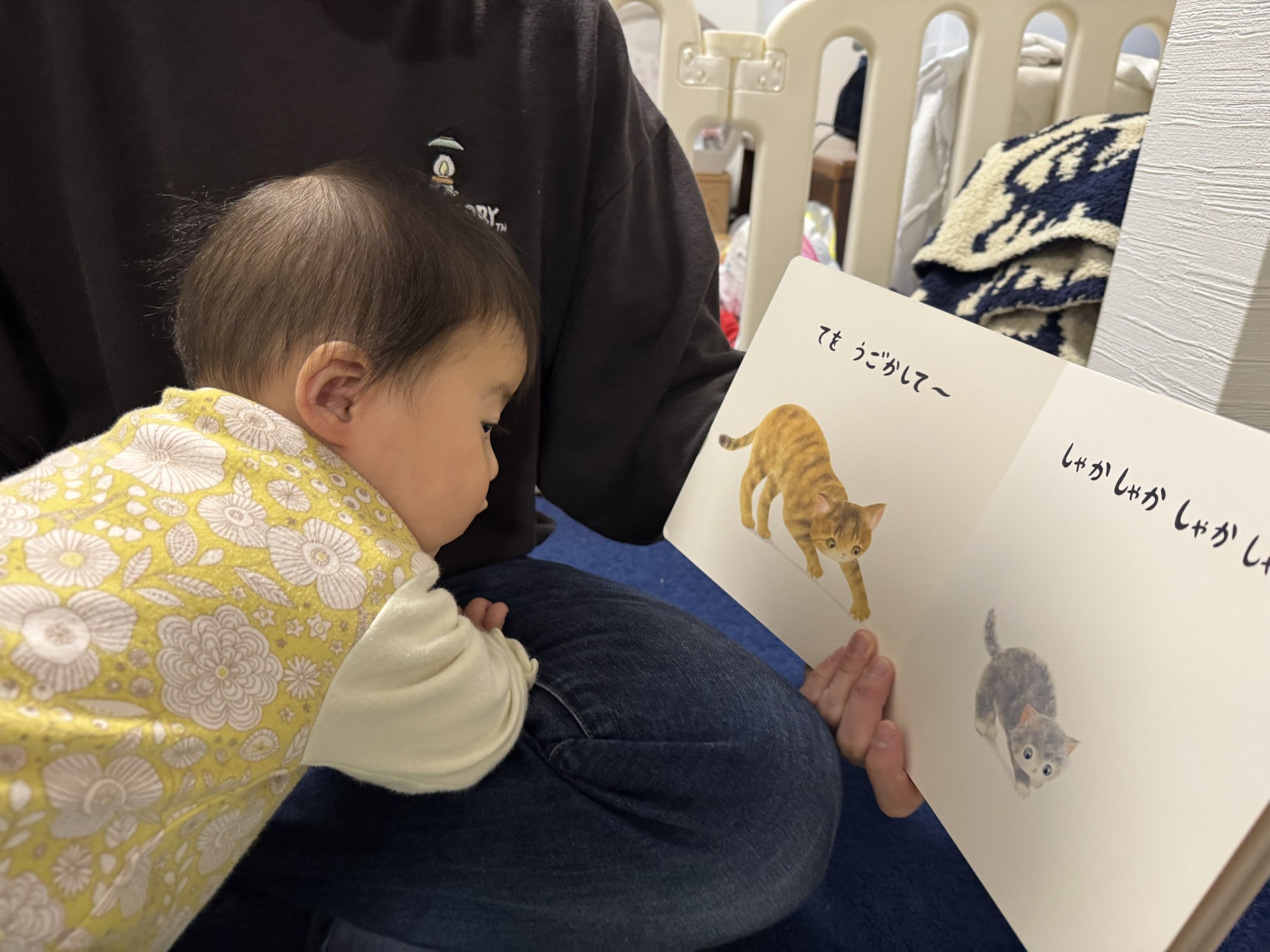 ママが絵本を読み出したら ずりずり近づいてきて 声を出して喜びます。