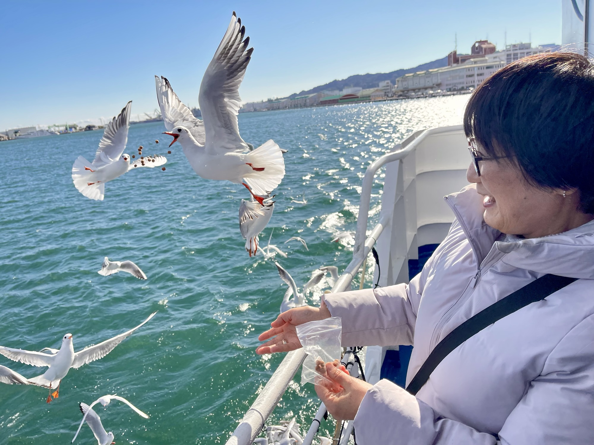 富士清水みなとクルーズではユリカモメがついてきて 船内に売ってるエサをあげると 一気にやってきて怖かった〜。