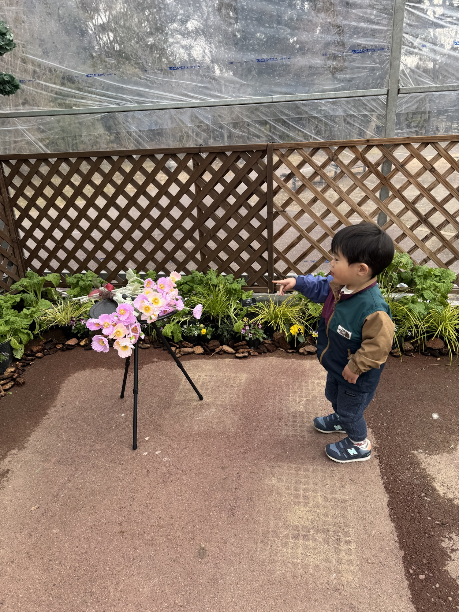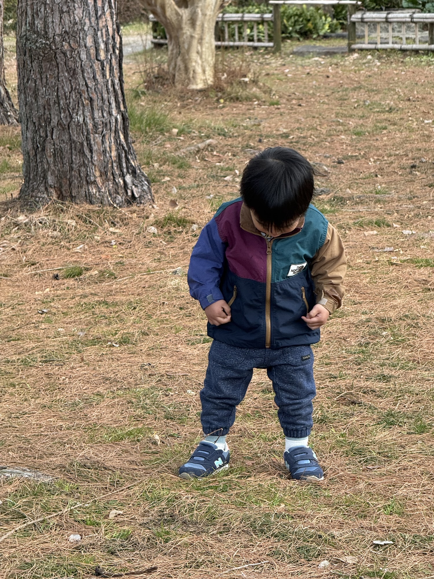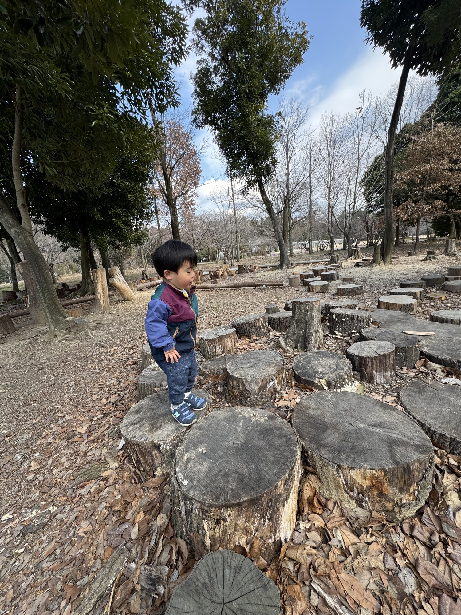 植物園の中では、鳥の囀りを聞いて笑ったり、落ち葉を踏んで音を楽しんだり、木の切り株が並べてある所でジャンプして遊んだり、風が吹いて来たら「うわぁ〜、寒いね〜」って風を楽しんだり 自然万物が楽しませてくれます。