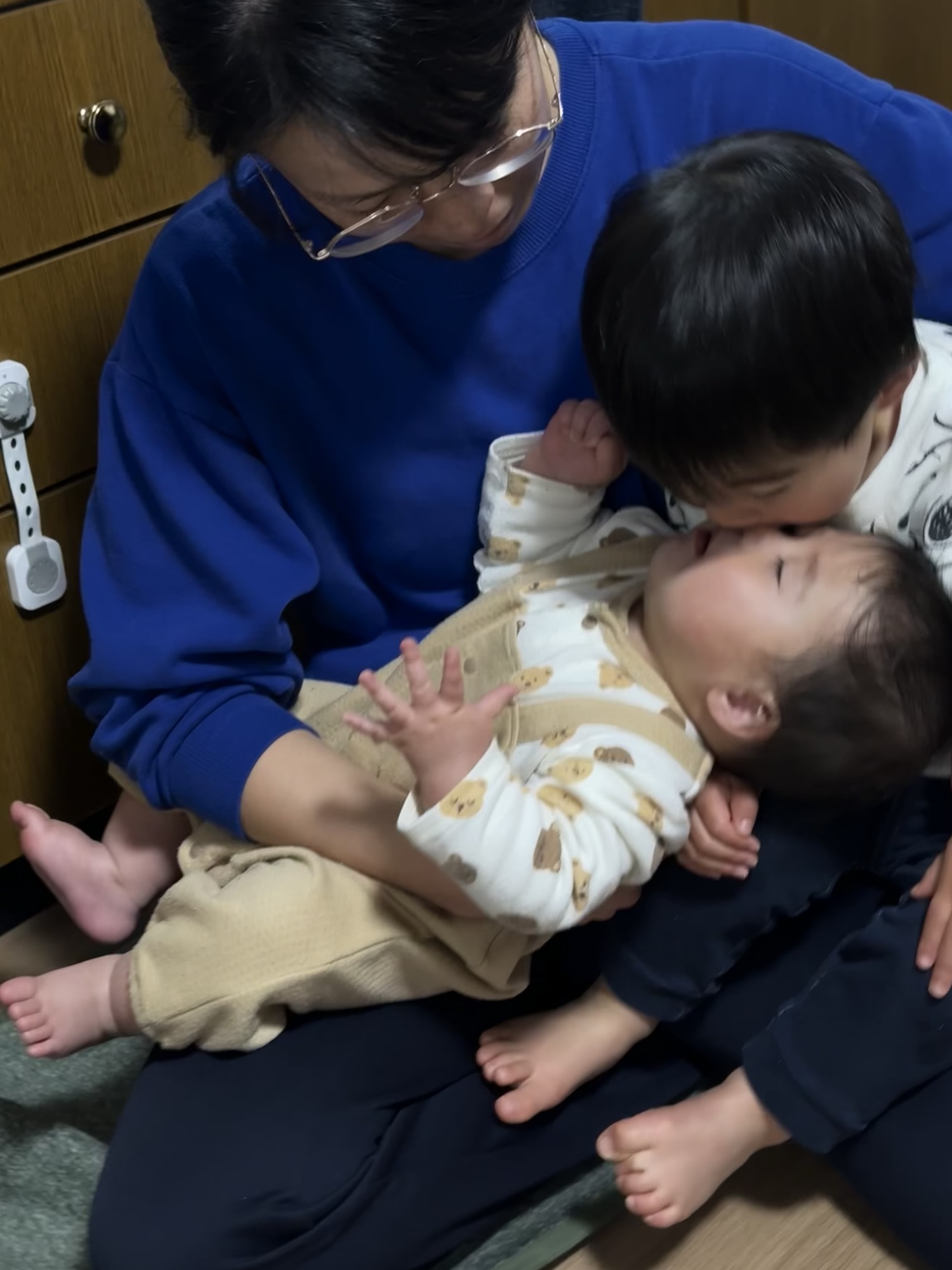 だっこマンのおもちゃ触りに行っては 叩かれてるけど、お兄ちゃん大好きですぐに ひっつきに行きます。
