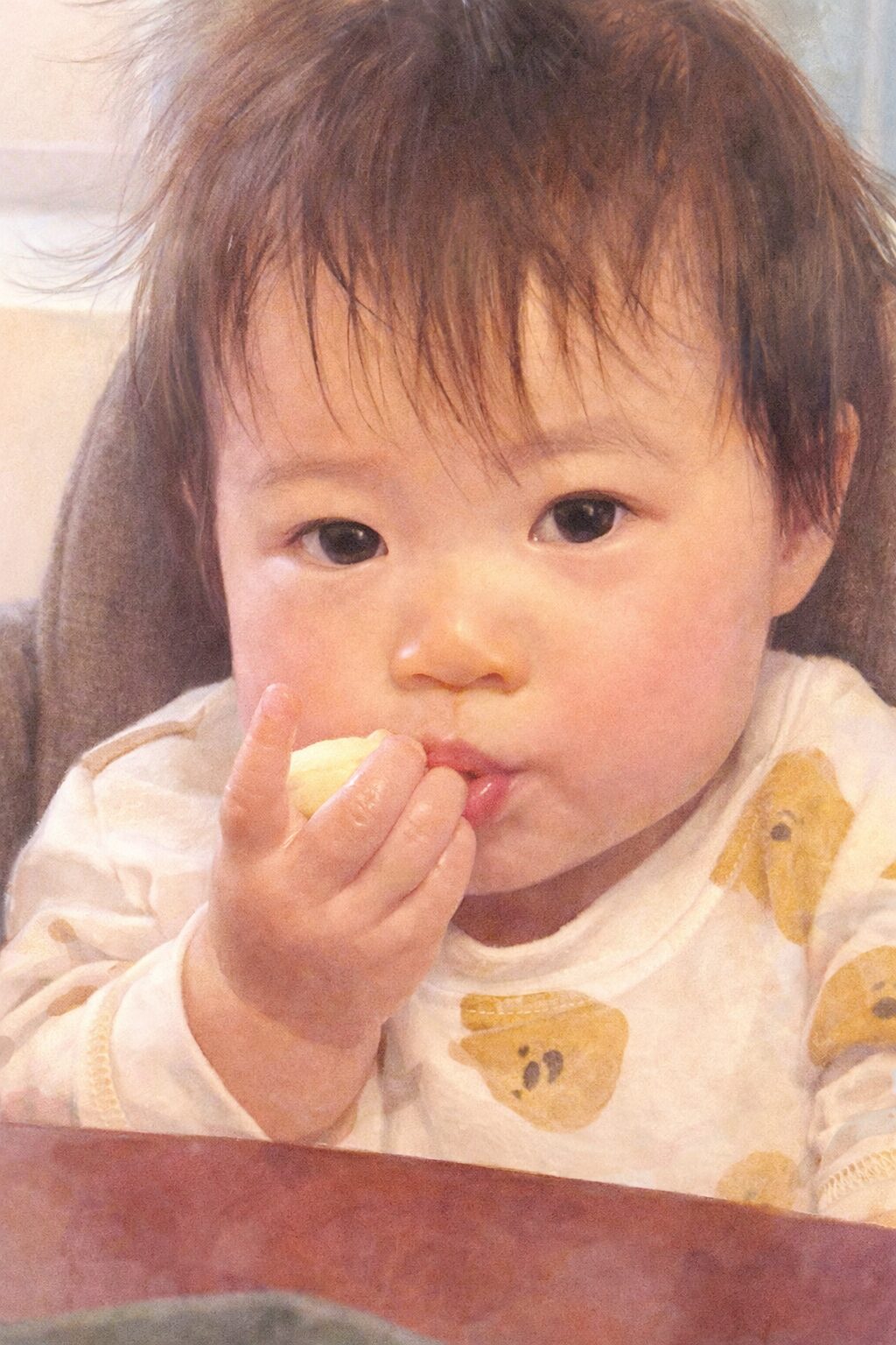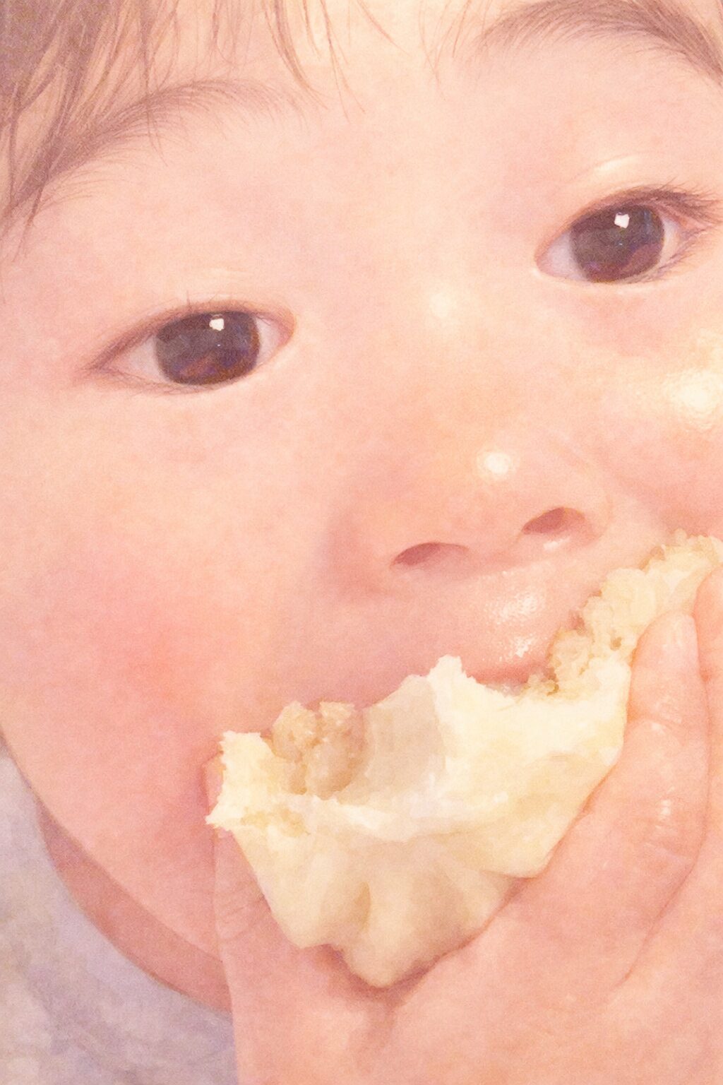 食べ方がわからなくて ママに半分に割ってもらって 一口食べただっこマン
