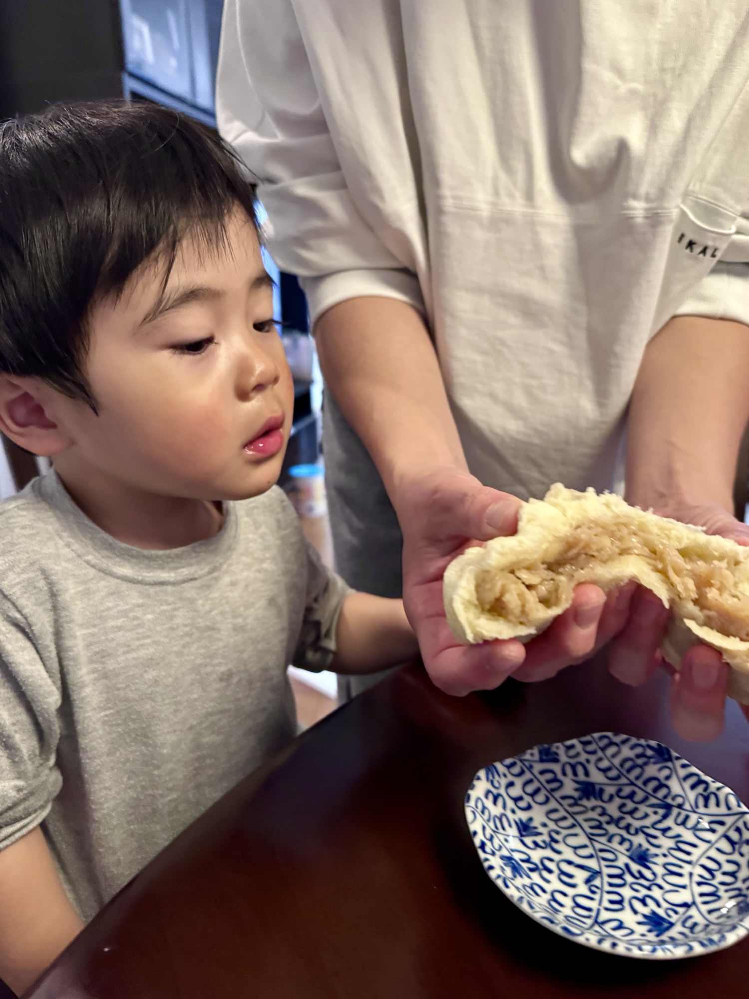 ほほえみ天使は豚まんの皮の部分をもらって黙々と食べてました。