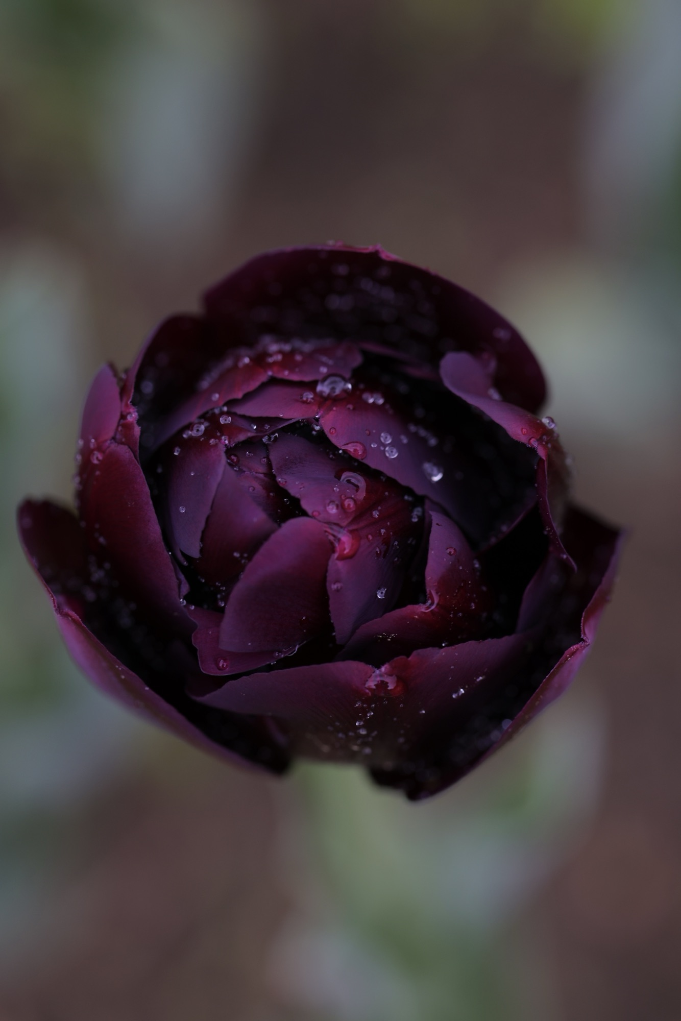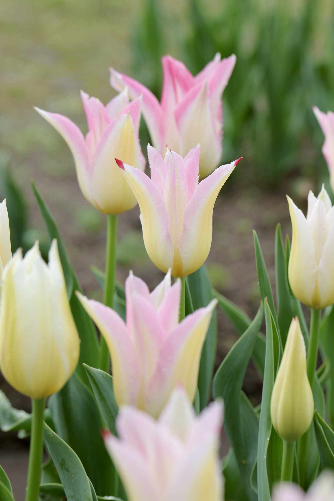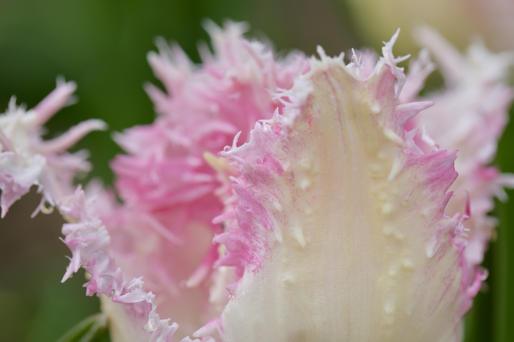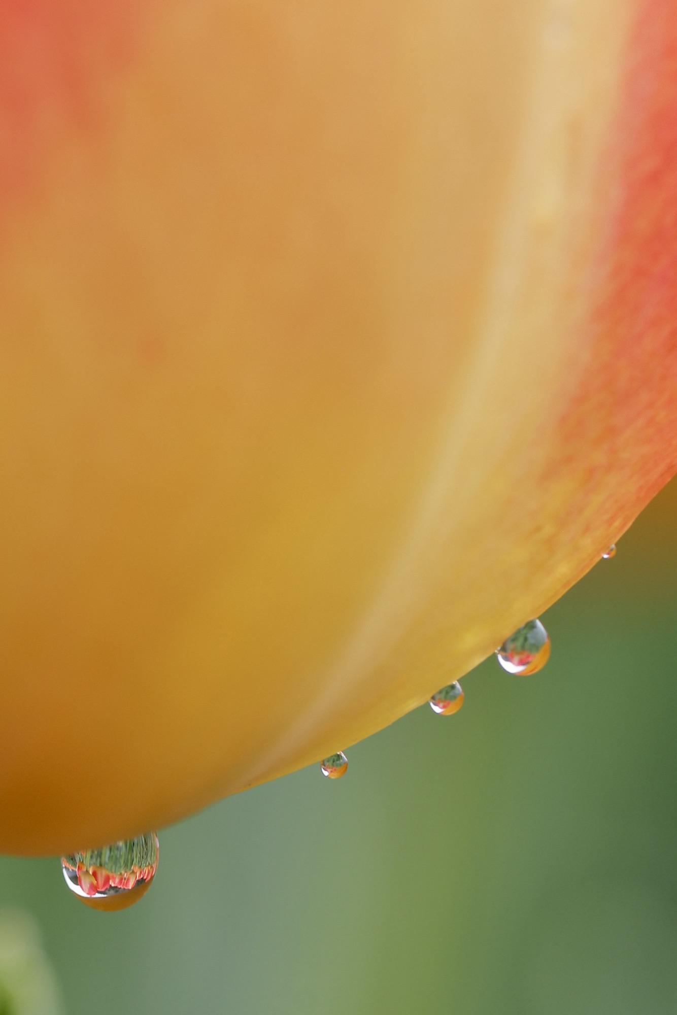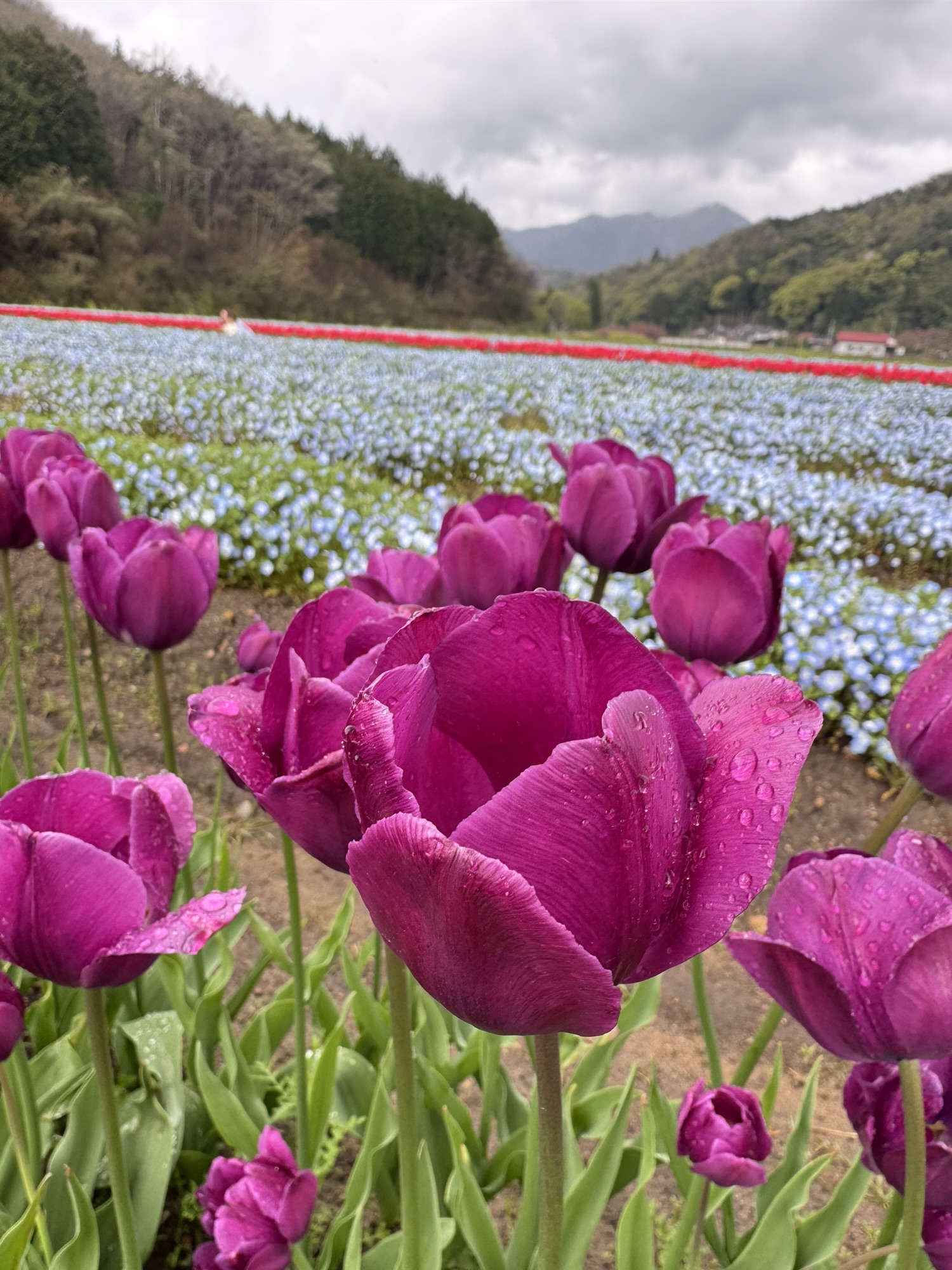 雨が降ったので 雨粒の中にチューリップ畑が映り込んでます。