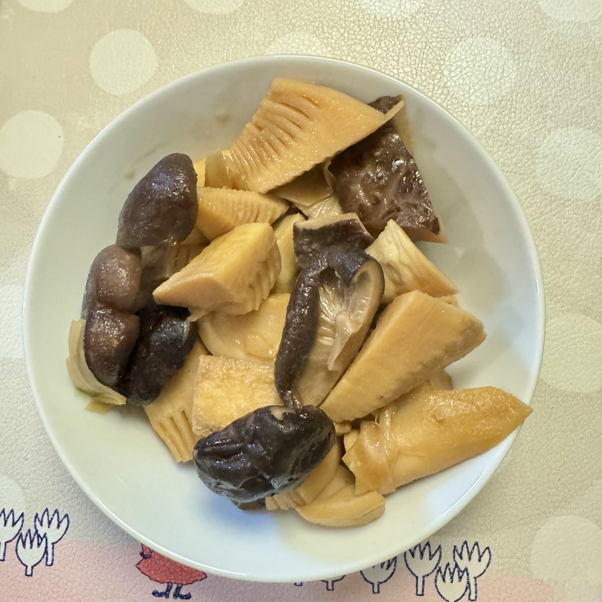 先日但東チューリップ祭りに行った時に買った 干し椎茸とたけのこの煮物にしました。