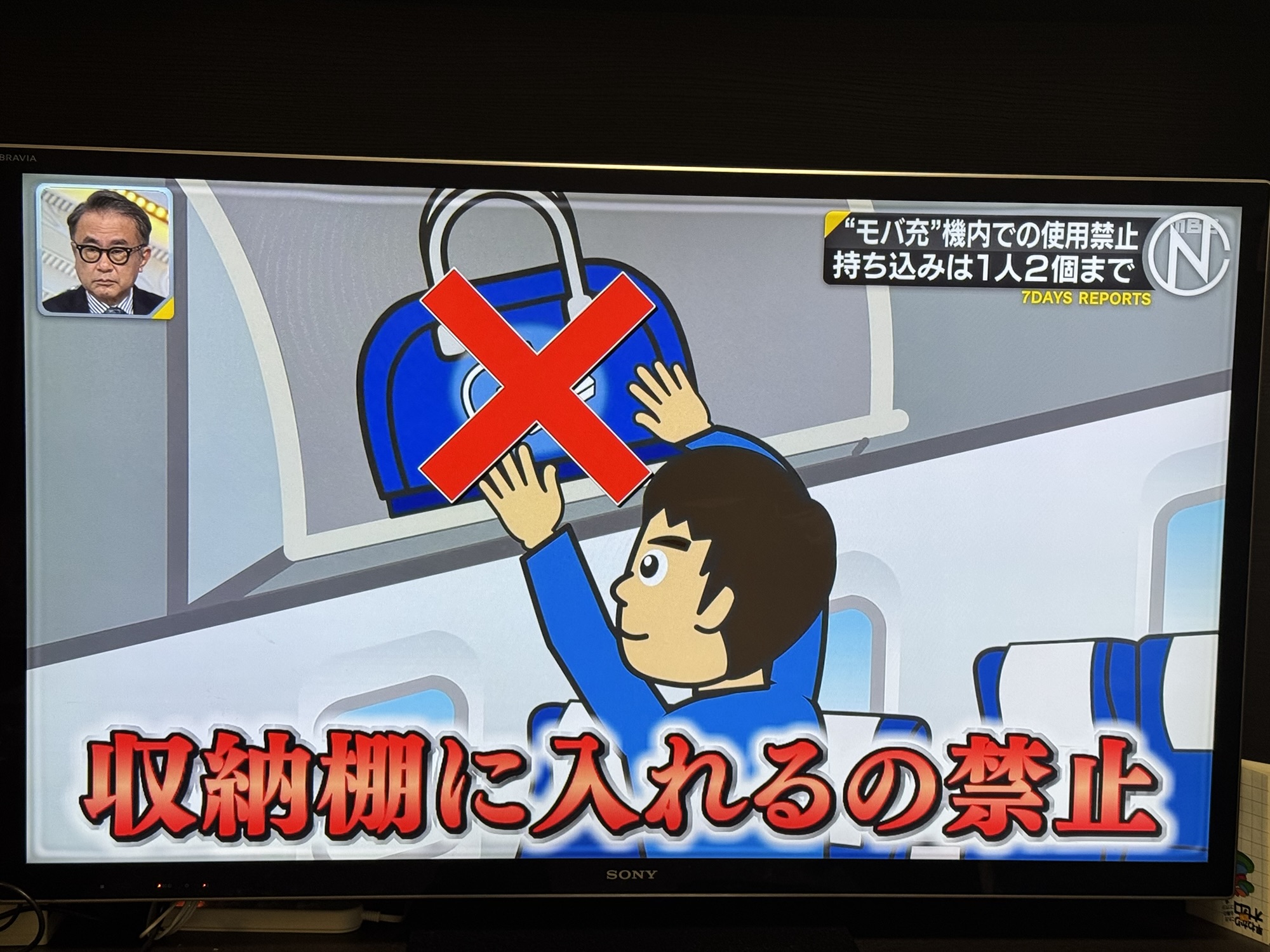 モバイルバッテリー 預け荷物に入れたらダメなのは前からですが、機内収納棚に入れるのも禁止。もしも発火した場合 すぐに異常がわかるように 手元に置かないといけないです。