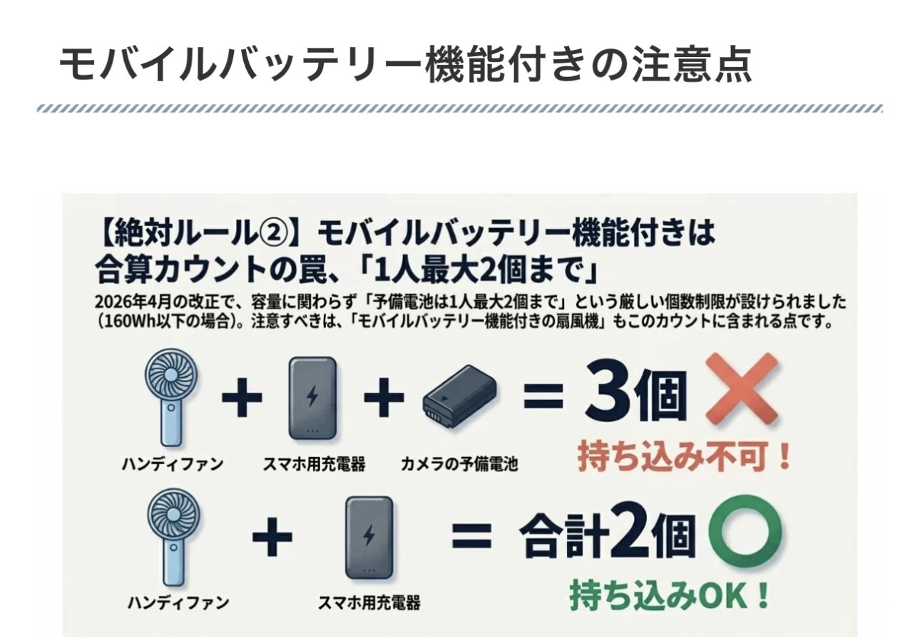 モバイルバッテリーは持ち込みは 1人2個まで。